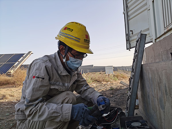 6月是光伏發(fā)電的高峰期,但環(huán)境溫度高、地域風(fēng)沙大,導(dǎo)致現(xiàn)場逆變器室積塵嚴重,設(shè)備散熱效果不佳,部分散熱風(fēng)扇受當?shù)仫L(fēng)沙影響,無法正常工作,逆變器室因溫升限負荷報警,一定程度上制約了光伏板正常發(fā)電。“難題”擺在眼前,卻難不倒這群大漠電站的年輕人,為不影響峰值輻照的發(fā)電量,他們搶在太陽升起前便開始動身,備好備件、持好工具,快速趕到現(xiàn)場,一頓“快查、快拆、快換”靈活操作,2小時完成了40多個堵塞風(fēng)扇的更換工作。到太陽高照的時候,他們再次赴現(xiàn)地檢查和處理低效發(fā)電組串,解決處理限制發(fā)電量的突發(fā)異常。一次次地現(xiàn)場排查、問題處理促進了發(fā)電量穩(wěn)步提升。