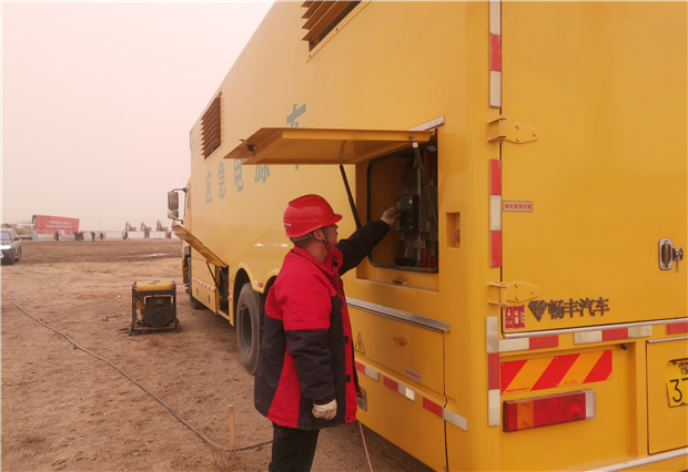 開工儀式當(dāng)天沙塵天氣持續(xù),揚(yáng)沙隨風(fēng)彌漫,突擊隊(duì)的保電人員不辭辛苦一大早便提前進(jìn)入會(huì)場(chǎng)。將發(fā)電車??吭谇捌诓榭钡闹付ㄎ恢茫龊冒踩O(jiān)護(hù)相關(guān)的工作之后,啟動(dòng)車輛試運(yùn)行,檢查了各項(xiàng)儀表數(shù)據(jù),并做好與用戶側(cè)供電設(shè)備的對(duì)接,全力以赴投入保電工作。該分局領(lǐng)導(dǎo)帶領(lǐng)保電人員全程守候在現(xiàn)場(chǎng),隨時(shí)應(yīng)對(duì)突發(fā)停電事故的發(fā)生,確保了開工儀式用電萬無一失。