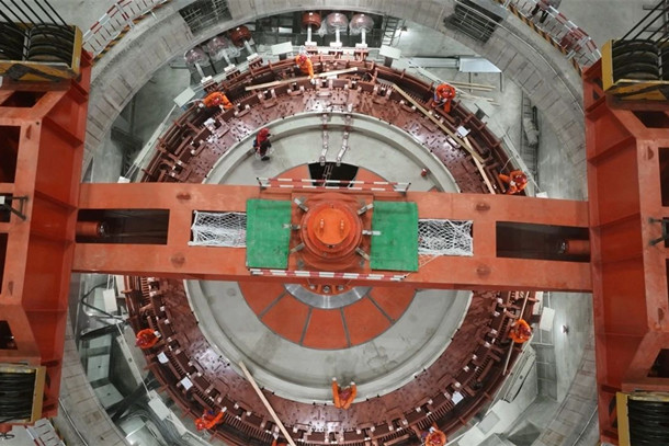 圖為雙江口水電站首臺機組轉(zhuǎn)子順利吊裝就位