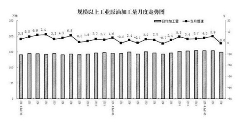 原油加工量下降。4月份,原油加工量4445.2萬噸,同比下降0.6%;日均加工量148.2萬噸,比3月份下降3.3%,這主要是受部分大型石化企業(yè)停產(chǎn)檢修影響。主要成品油生產(chǎn)也有所回落,其中,汽油產(chǎn)量同比下降4.0%,煤油產(chǎn)量增長(zhǎng)2.2%,柴油產(chǎn)量下降0.6%。1-4月份,原油加工量18251.0萬噸,同比增長(zhǎng)3.1%,比1-3月份回落1.4個(gè)百分點(diǎn)。