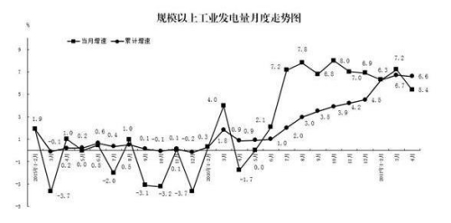1-4月份,發(fā)電量19382.4億千瓦時(shí),同比增長(zhǎng)6.6%,增速比1-3月份回落0.1個(gè)百分點(diǎn)。