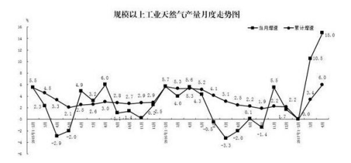 1-4月份,天然氣產(chǎn)量509.4億立方米,同比增長(zhǎng)6.0%。進(jìn)口2011萬噸[4],增長(zhǎng)5.4%。