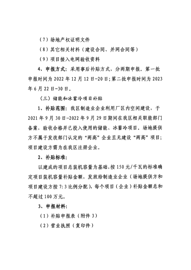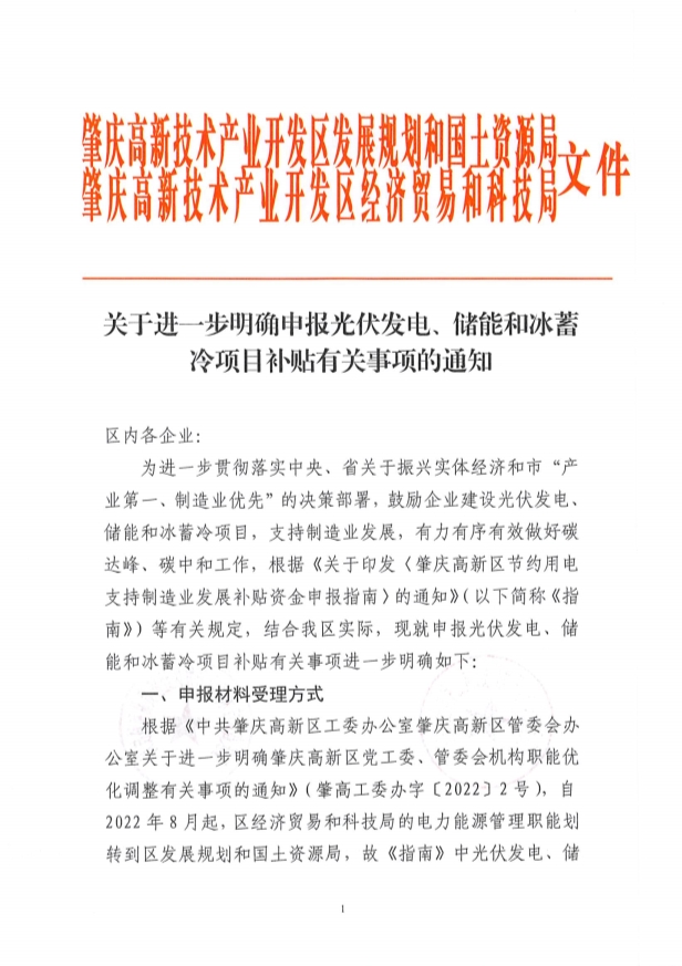 為進一步貫徹落實中央、省關于振興實體經(jīng)濟和市“產(chǎn)業(yè)第一、制造業(yè)優(yōu)先”的決策部署,鼓勵企業(yè)建設光伏發(fā)電、儲能和冰蓄冷項目,支持制造業(yè)發(fā)展,有力有序有效做好碳達峰、碳中和工作,根據(jù)《關于印發(fā)〈肇慶高新區(qū)節(jié)約用電支持制造業(yè)發(fā)展補貼資金申報指南〉的通知》(以下簡稱《指南》)等有關規(guī)定,結合我區(qū)實際,現(xiàn)就申報光伏發(fā)電、儲能和冰蓄冷項目補貼有關事項進一步明確如下: