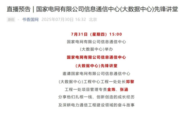 7月30日《書香國網(wǎng)》公眾號先鋒講堂直播預(yù)告推文顯示,國家電網(wǎng)有限公司信息通信中心(大數(shù)據(jù)中心)這一機(jī)構(gòu)名稱首次出現(xiàn)。