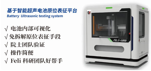 Feli 系列電池超聲波檢測(cè)系統(tǒng)是一種無(wú)損原位表征手段,廣泛應(yīng)用于電池生產(chǎn)廠、高校、研究院所,以及電池回收利用等領(lǐng)域,可用于電池研發(fā)實(shí)驗(yàn)室,生產(chǎn)工藝室、質(zhì)量部、生產(chǎn)過(guò)程的抽檢、出廠檢測(cè)、電池安全壽命預(yù)測(cè)等部門。