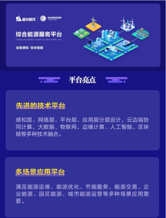 遠(yuǎn)光綜合能源服務(wù)平臺(tái)是以物聯(lián)網(wǎng)為載體,以大數(shù)據(jù)、人工智能等技術(shù)為基礎(chǔ),提供綜合能源供應(yīng)、銷售、消費(fèi)服務(wù)的綜合服務(wù)云平臺(tái)。平臺(tái)以能源用戶為中心,提供信息采集、能效分析、節(jié)能服務(wù)、需求響應(yīng)、能源托管、能源交易等服務(wù),為綜合能源服務(wù)商的客戶服務(wù)、業(yè)務(wù)創(chuàng)新、商業(yè)模式創(chuàng)新等提供支持。平臺(tái)可支撐企業(yè)綜合能源、園區(qū)綜合能源、智慧城市綜合能源運(yùn)營。