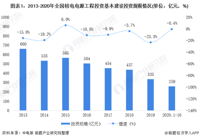 受到福島核電站等事故的影響,我國(guó)核電建設(shè)雖然處在高速發(fā)展期,但是保持著以“穩(wěn)”為主的基調(diào),新開工機(jī)組數(shù)量較少,核電工程投資額有所下滑。根據(jù)中國(guó)電力企業(yè)聯(lián)合會(huì)的統(tǒng)計(jì)數(shù)據(jù)顯示,2020年1-10月,全國(guó)主要核電企業(yè)電源工程完成投資259億元,同比下降0.4%。