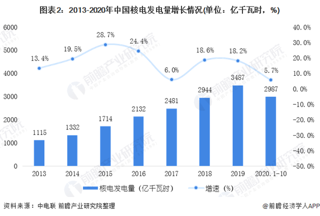 雖然近年來(lái)受國(guó)家核電批復(fù)減少以及新建投資額的降低的影響,我國(guó)核電主要企業(yè)電源項(xiàng)目在建規(guī)模有所縮小,但是隨著項(xiàng)目的完工,我國(guó)核電裝機(jī)規(guī)模不斷擴(kuò)大,發(fā)電量同步提高。根據(jù)中國(guó)電力企業(yè)聯(lián)合會(huì)的數(shù)據(jù)顯示,2020年1-10月,全國(guó)核電發(fā)電量2987億千瓦時(shí),同比增長(zhǎng)5.7%,增速比上年同期回落13.6個(gè)百分點(diǎn)。