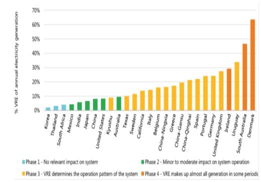 圖1 不同國家/地區(qū)波動性可再生能源發(fā)電占比及相應的系統(tǒng)集成階段(2018年)