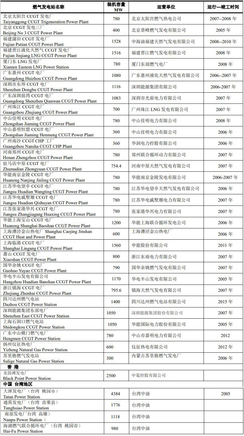 中國(guó)主要以燃煤發(fā)電為主,其次為燃?xì)獍l(fā)電的份額不高,但是進(jìn)展比較快。目前中國(guó)燃?xì)獍l(fā)電站如表。