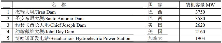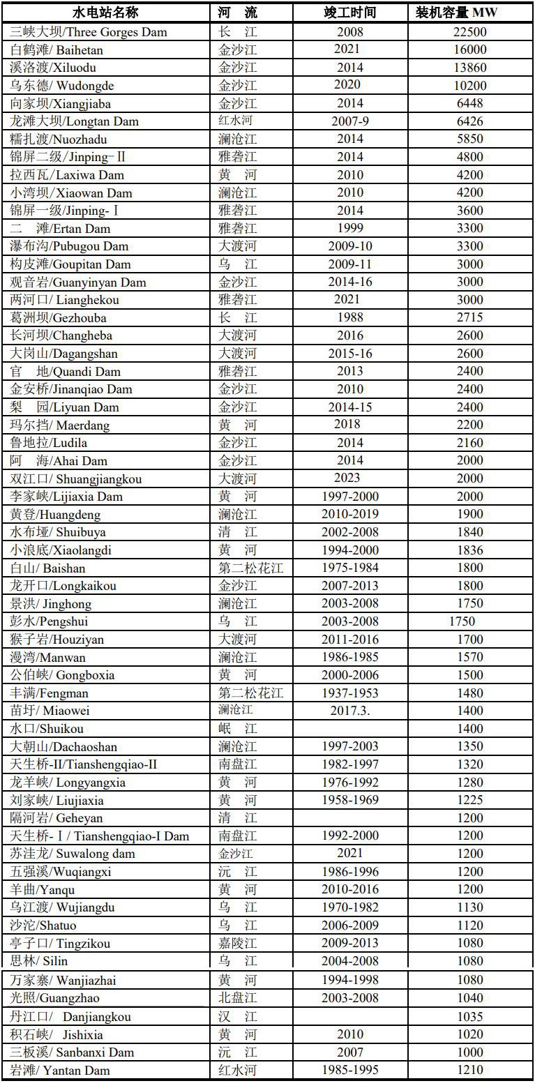 中國投產的裝機容量在1000MW以上的水力發(fā)電站