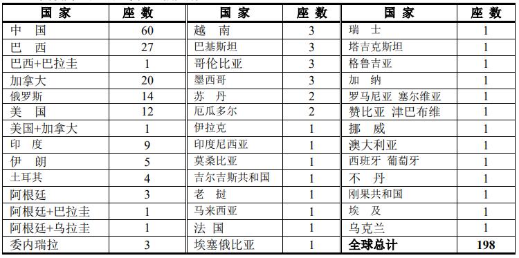 ▲ 世界上水電站裝機容量在1000MW以上的有198座,其中中國占據了60座,居世界總數的60/198=30%。其次為巴西、加拿大、俄羅斯。